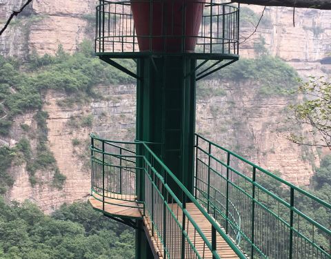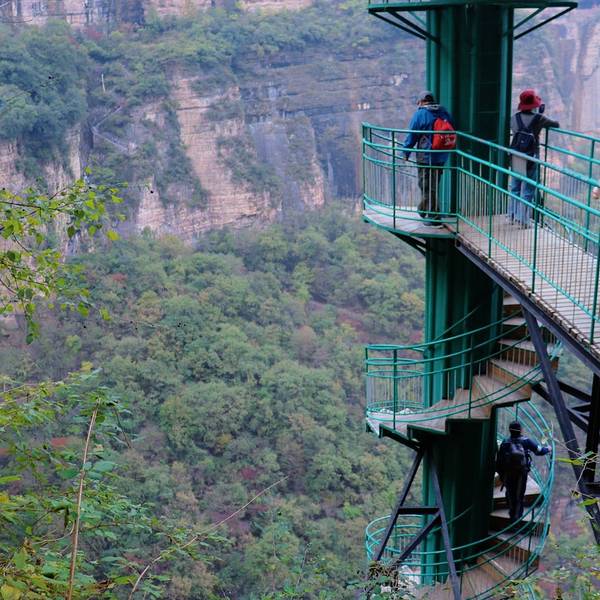 顺着这个“之”字形白色铁梯,爬到山顶处,视线开阔,更好地领略太行山峡谷风情。