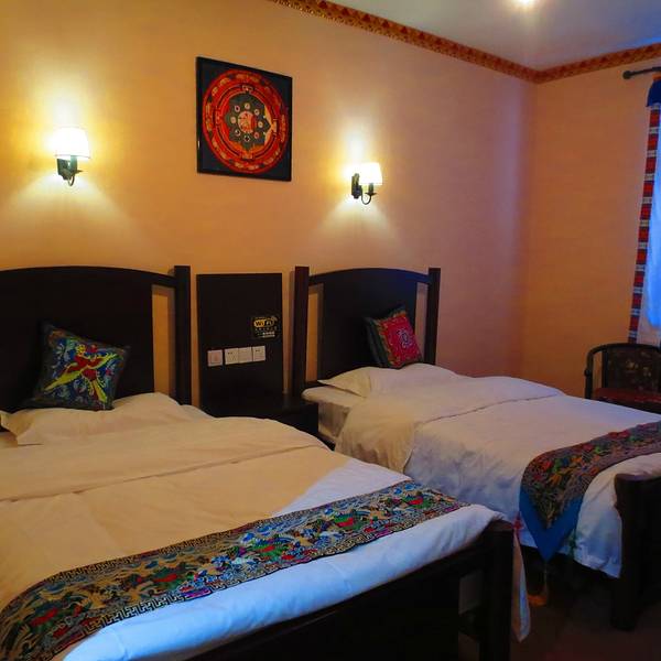 早晨7:50到广元站,门口挨着就是长途汽车站,买了10:20去九寨沟的班车,¥92/人,客车挺新的,对号入座。中间这些时间就在市里找建行取款。中途取道甘肃省,下了高速就走山里盘山路,一直沿着一条挺宽清澈的河流。行到12:30在路边一家小餐馆让乘客休息饭,快餐每人10元,12:50继续上路。妈的我晕车要死了。下午四点多终于到了九寨沟县老车站,可是去沟口的车是从新站发,于是大家还得打黑车去新站。没有公交出租,很荒凉,黑车坐到新站一人五块,挺近的。不过拉到地方以后司机会告诉你去沟口的公交已经停运啦~扯淡,客栈老板说公交会一直跑到18:00,而那时才四点半不到。但当时实在是晕车难受得不行,也懒得争了,讨价还价两句,一人10块给拉到沟口了。也算好运,网上说打车要一人20呢,而且司机看我一副快不行的样子,到了沟口还多送了一截路,一直送到天堂口,我们订客栈的地方,总路程大约45min。 站在天堂口牌子底下打电话给九寨沟窝客栈,小姐们很快来接了,转个弯就到。在这里要特别推荐一下客栈,是我住过的所有酒店客栈里性价比最高最满意的一家,具体可以上去哪儿网查询,我就是按好评排名预定的。这天余下的时间就全在晕车恢复中了,去附近药店拿了药,还算见效,临睡就基本好了。