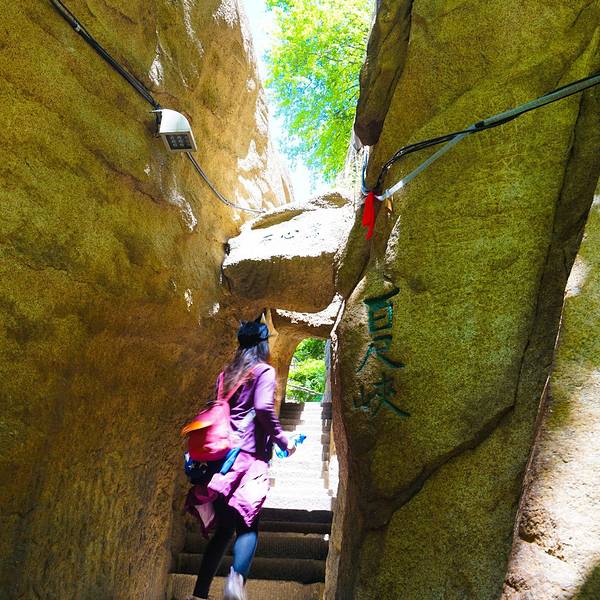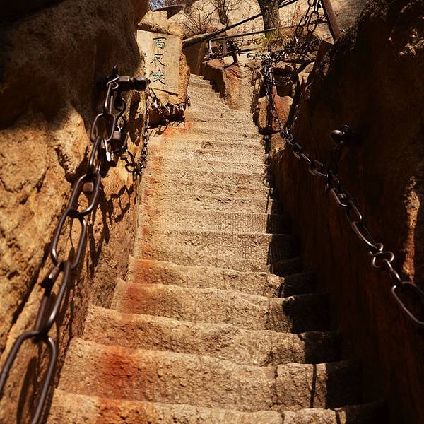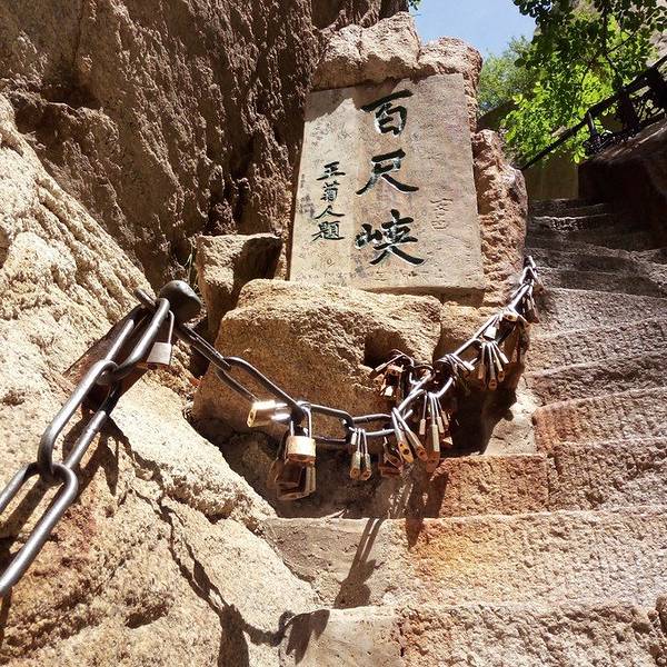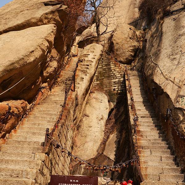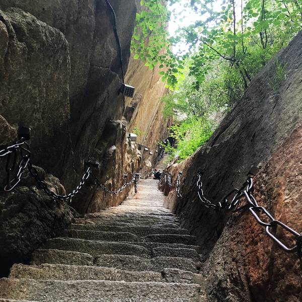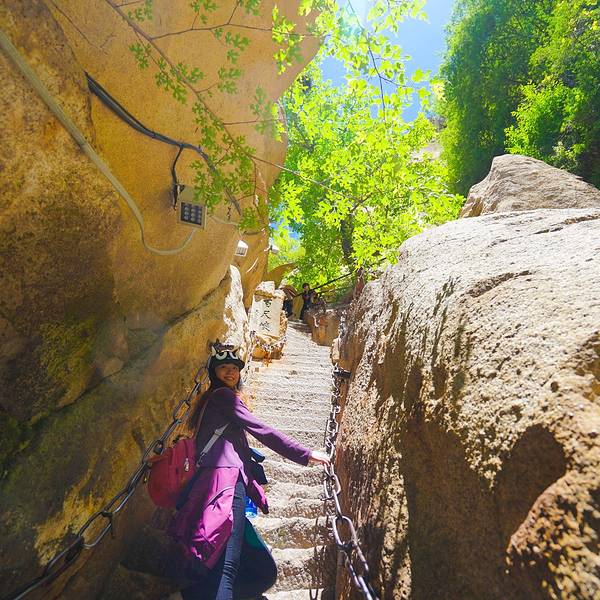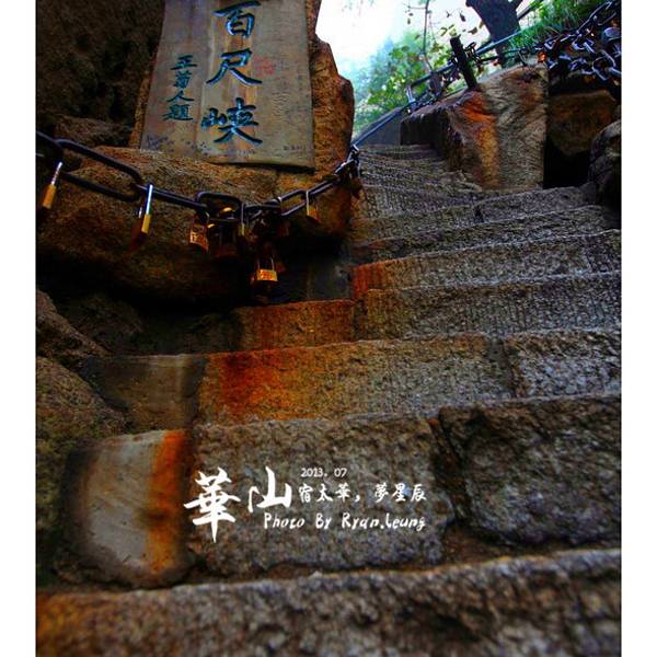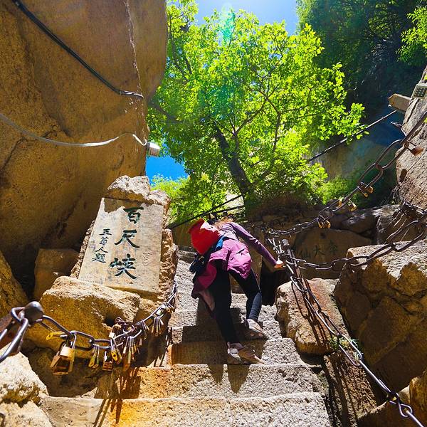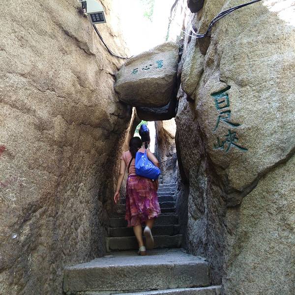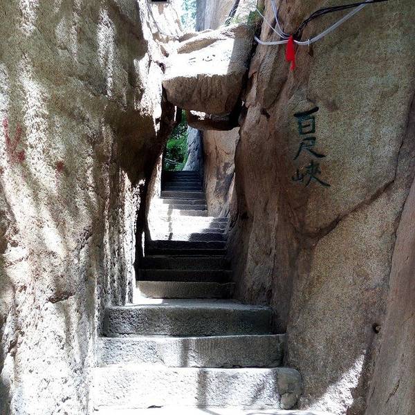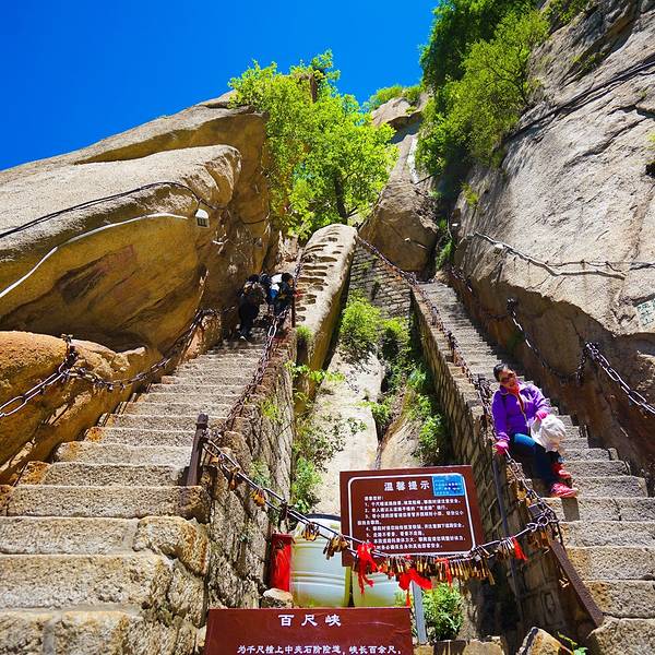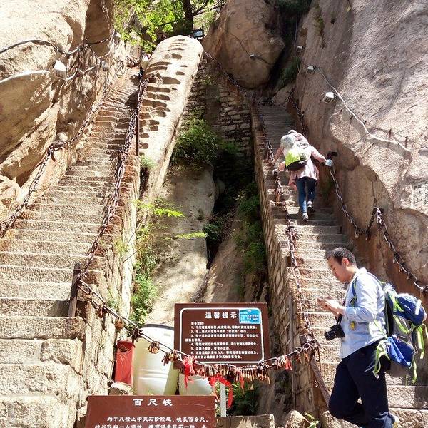 脚会抖得特别厉害!『百尺峡』这条路爬的相当的辛苦,而且还不怎么敢回头望,梯度特别大过完『千尺幢』,马上就是『百尺峡』,虽没有『千尺幢』那么长,仅46米,石阶91级,但仍是华山天险之一,又是一大挑战!『百尺峡』这条路爬的相当的辛苦,而且还不怎么敢回头望,梯度特别大!