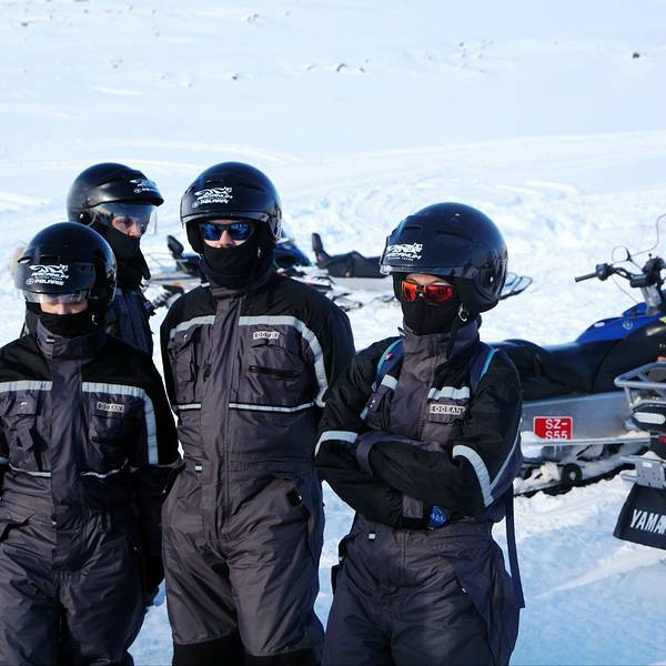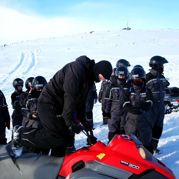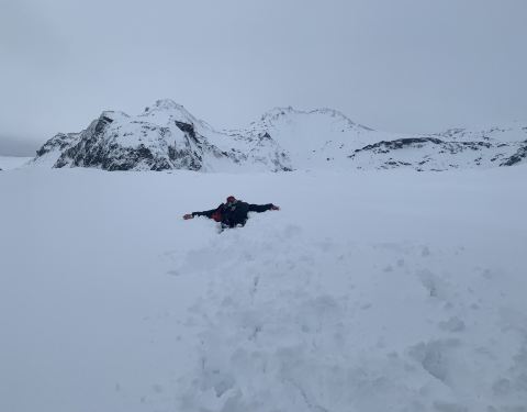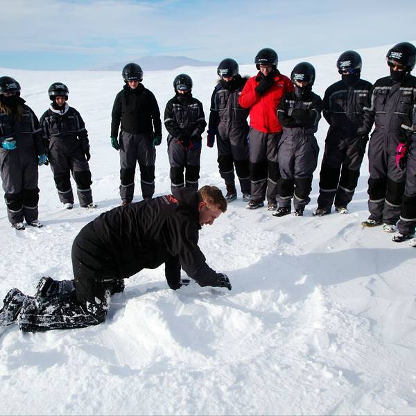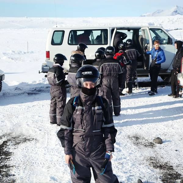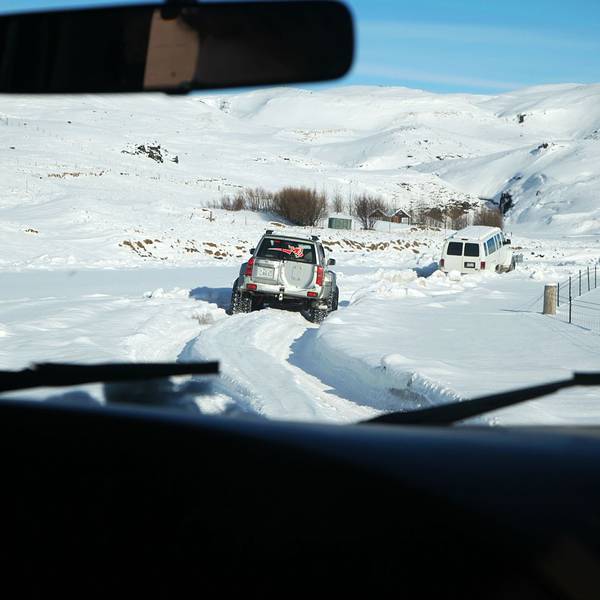 自由活动了一会儿,向导把大家聚集到一处,在雪地上拍了个地形图出来,跟我们讲了讲冰岛的火山和冰川这段车程大概在20-30分钟左右,很快根据GPS指示,我们就拐上了这条支路,迎面而来的就是米达尔斯冰原了。和想象中的严酷不同,这雪,看着忒萌了。