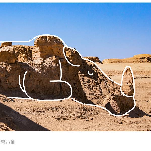 看来在这里,治沙的路还很长啊!假装走到到了沙漠方山状雅丹!看这形状,没错了吧!在我眼里,这是一只正伏在地上睡觉的犀牛,应该没人会有异议吧~哈哈哈哈