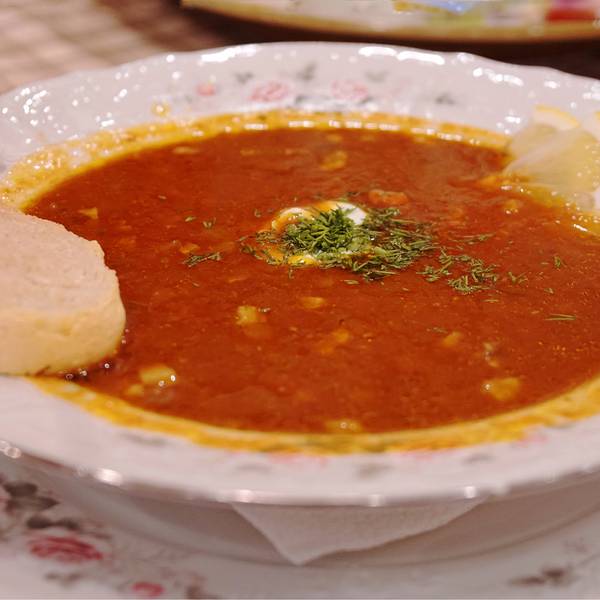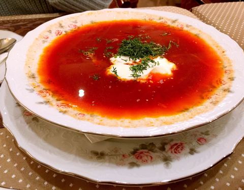 而服务员都是身穿复古女仆装,电视里还播放着苏联电影,非常俄式风情。就餐时,偶尔被陆陆续续爆开的气球吓到了,吃都不能很安心😂点了六道菜,每道菜都很符合我们口味!这是最满足的一餐!性价比很高!红菜汤成了必点菜式,带有酸酸甜甜有点梅子口味,也是在俄最喜欢的一道菜!虽然这家店算是这么多餐比较贵的一家,但是用力吃人均不过百!物价真让人感动。