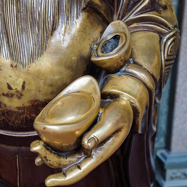 庙里很多财神,我们有样学样,摸摸财神爷手上的元宝,然后塞钱进去,祈求发财。