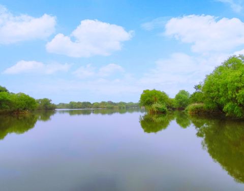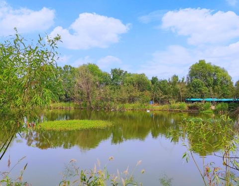 这个景区由码头、大地景观和生态岛屿做成,人与自然和谐相处,水草繁茂。湿地以山为图,以水为影,美如山水画一样。芦苇深深,清新舒适,湖泊交错。包含农田景观区、观鸟区、荷塘秀色等片区,是集原生态展示、农耕文化体验、旅游观光于一体的综合湿地文化景区。