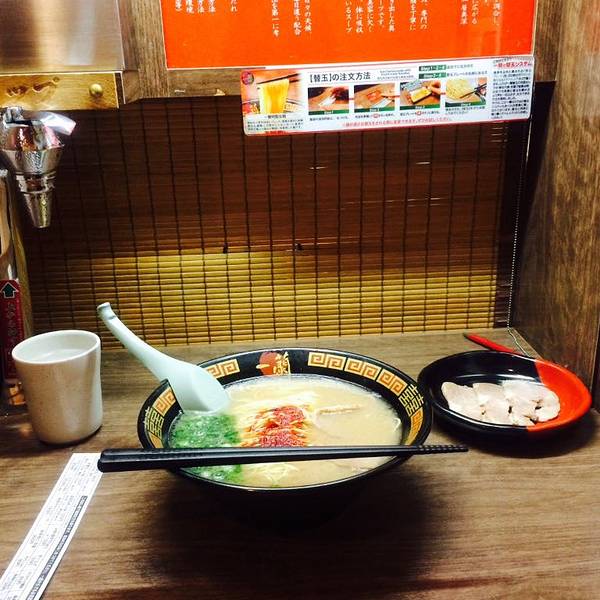 每次去比多点一份叉烧(180日元)其实它的普通面就已经加了三片了。(●'◡'●) 它的座位是和隔壁个开来的,前面那个帘子是服务员点餐上菜的窗口,上完面后他会放下帘子,让你在自己独自的空间里不用顾忌吃相大口吃。他是24小时营业的,所以随时可以吃到。