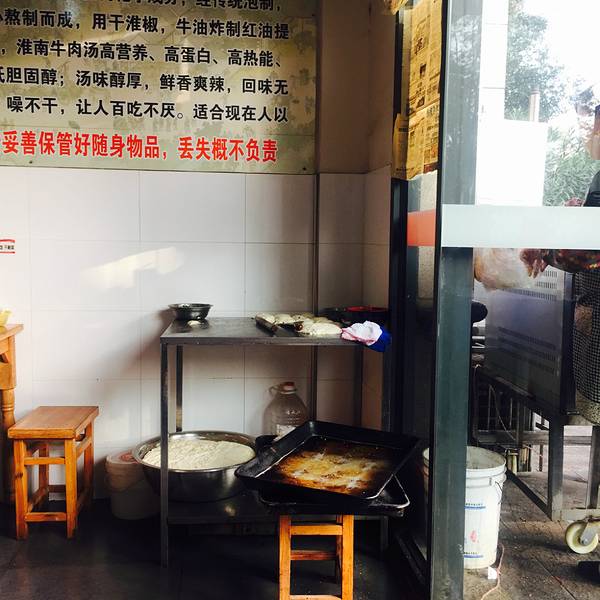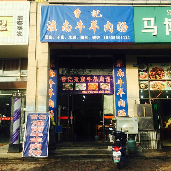 曹记淮南牛羊肉汤馆内简介说,牛羊肉汤,四季皆宜:春爽口,强身壮骨;夏清热,开胃健脾;秋去火,恢复元气;冬暖胃,大补大益。不过,个人更倾向于这寒冷的天气喝一碗,全身都暖。 曹记淮南牛羊肉汤是同事推荐给我的,位置也很好找,马鞍山市花山区东晖路与蓬莱路交叉口往东晖路北侧前行20米处,隔着东晖路对面就是万嘉颐园菜场。公共交通方面,只有107路公交车,停靠万嘉颐园站。 曹记淮南牛羊肉汤馆内主要经营牛肉汤、牛杂汤、牛肚汤、牛筋汤、牛肉粉丝千张、牛肉米线千张等各种牛肉汤;羊肉面、羊肉千张、羊杂面、羊杂粉丝千张等各种羊肉汤;凉拌牛肉、凉拌牛杂、凉拌牛肚、凉拌羊肉等各种凉拌类;还有就是现做现烤的脆烧饼。价格方面,像牛肉汤、羊肉汤、羊杂汤等的汤类,小碗10元、大碗15元;像牛肉或羊肉粉丝、千张和面类,小碗9元、大碗11元;凉拌类食品30元/盘。强烈推荐大家试吃烧饼,1元1个,又脆又香,真心不错。 曹记淮南牛羊肉汤馆内环境一般,角落里还有餐饮服务食品安全等级C级的标识,不过服务还蛮好的,店内有两个工作人员,一个小伙子负责牛羊肉汤,一个大姐负责做烧饼。 因为四周都是居民生活区(汇成上东小区、西湖花园小区和万嘉颐园小区),所以人流量较大,加之物美价廉所以曹记淮南牛羊肉汤生意非常红火! 温馨提示:本人吃了碗牛肉粉丝汤,太烫了,又赶着上班,急匆匆的吞咽,出门才意识到口腔黏膜全破了,甭提多悲催!所以,前车之鉴,吃慢点!