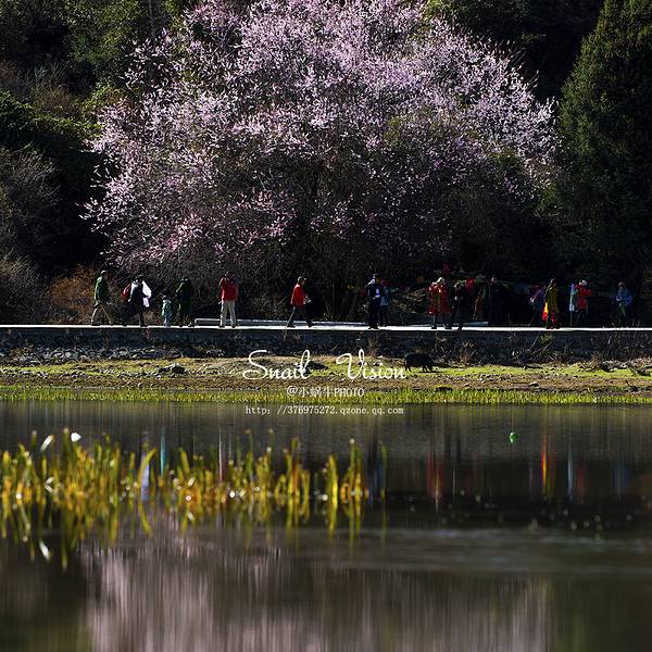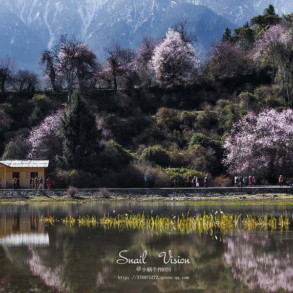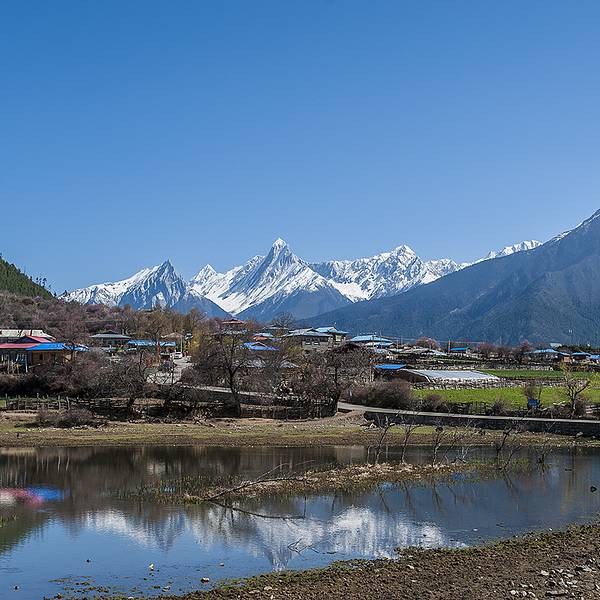 来到这里就被这里美好的画面震撼住,雪山之下、桃花盛开、倒影、整个村子安静矗立在山间