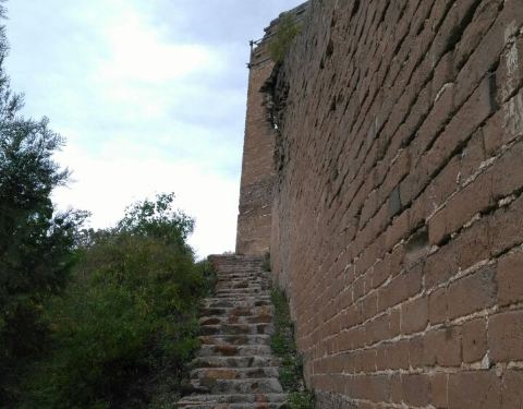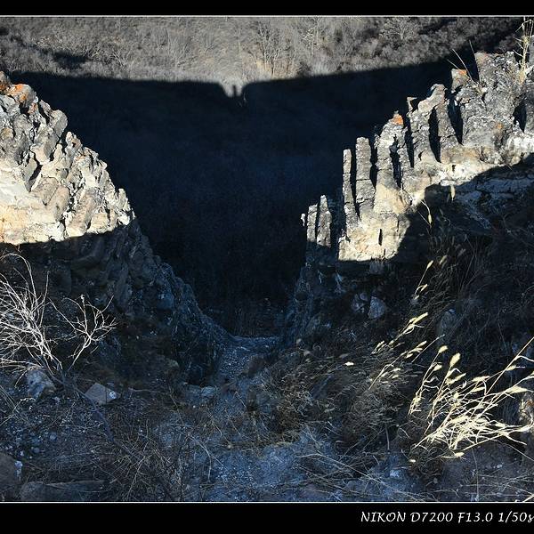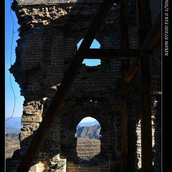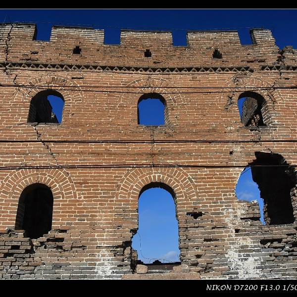 我经过其中的一个敌楼,四面围墙其中的一面沿着窗洞开始坍塌,导致游人面前无遮无拦,只敢扶着内墙向外向下俯瞰,要是脚急一点,恐有滑下去之嫌,这个要是在晚间倒是有点悬!
