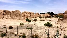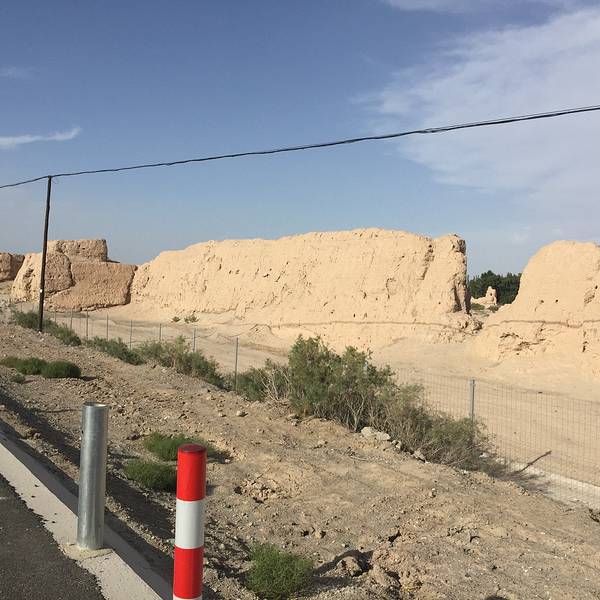 开车去锁阳城遗址路上路过,就在一个丁字路口,右转弯的时候无意看到左首处一处巨大的废墟,急忙开车过去开车去锁阳城遗址路上路过,就在一个丁字路口,右转弯的时候无意看到左首处一处巨大的废墟,急忙开车过去。 走近看了,只剩下残缺不堪的城墙了,四周围着栏杆,不能进入。 不收门票,也没有专人管理。