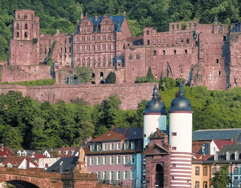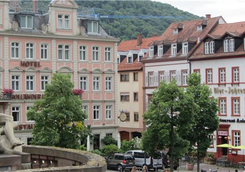 海德堡的老城区是这座城市的观光中心,位于内卡河南岸傍河而建的长条形区域,这里的大街小巷完好地保留着风格古朴的建筑。老城区的景点分布于内卡河的两岸,与内卡河平行的海德堡步行街(Hauptstrasse)是欧洲最长的步行街之一,沿途有各种商店、景点、和餐馆,是老城区的中心地带。 德国最古老的海德堡大学也位于此,使得这里不仅有深厚的文化底蕴,更有年轻人的蓬勃朝气。海德堡老城区的景点很集中,一天时间可以步行游览完毕,时间充裕的话不妨放慢脚步,细细品味这个让歌德将“心遗落”的地方。 老城看点 游览老城区可以以俾斯麦广场为起点,沿着海德堡步行街边走边逛,小路由卵型石块铺垫,狭窄蜿蜒,这里有高端品牌商店,也有别具特色的手工艺品店、甜品店和各色餐馆。 著名的海德堡大学广场位于海德堡步行街的中心处,和国内的大学不同,这里没有校门也没有写着铭牌的标志,其氛围须细细体会。大学广场是海德堡大学中心所在,广场前白墙黑瓦的建筑是建于18世纪初的旧教学楼,里面有为建校500周年建立的华丽大讲堂,可以免费入内参观。离广场不远有一幢红砖墙描金装饰的大楼,十分抢眼,它是海德堡大学图书馆,里面展出了中世纪的珍贵书籍。之后,你可以去位于老大学楼内的学生监狱参观,之前这里是捣蛋的学生关禁闭的地方,现在成了展示他们禁闭生活的博物馆,门票可在入口处购买。 参观完后继续沿着步行街前行来到市集广场,这里的圣灵教堂很值得一看,这座典雅的哥特式红砖建筑已有近700年的历史。如果你想休息一下,就去教堂对面的Knösel咖啡馆(Café Knösel)坐一坐,这是海德堡最古老的咖啡馆,也是海德堡特色巧克力“大学生之吻”(Studentenkuss)的诞生地,不妨在此好好挖掘一下巧克力背后的故事。 来海德堡老城区游览的重中之重就是参观海德堡城堡了,在市集广场南边的粮食广场后方有前往城堡的缆车站,你可以搭乘缆车登上城堡山顶,也可以选择从粮食广场的石阶徒步上去(约15分钟),顺便欣赏沿途风景。 海德堡城堡坐落在王座山上,由红色砂石所建,虽已破败但仍不失昔日风采。进入城堡中庭,迎面矗立的是医药博物馆,展示了百年前的药物。它的左侧是菲德烈宅邸,壁面上刻有历代王者的雕像,它的地下室里有著名的大酒桶,直径有7米之长,可以试饮(一杯2.5欧元左右)。中庭右侧的火药塔还保留着当年遭法军炮击后的原貌。城堡后面有一片大花园,开放时间不限且可免费入内,你可以欣赏美丽的鲜花和喷泉,也可以在此眺望海德堡老城区风光。花园中央有一张歌德长椅,据说是歌德散步时最喜流连休憩之地。 游览完海德堡城堡可能已时近黄昏,这是漫步海德堡老桥和哲学家小径的最佳时刻。海德堡老桥(Alte Brücke)位于市集广场北边,由选帝侯卡尔·西奥多的名字命名。老桥建于18世纪,是内卡河上最古老的桥。老桥的入口有一尊手拿铜镜的铜猴雕像,据说摸一摸铜镜能带来好运,摸摸猴子的右手手指能重返海德堡,想要求子,就摸一摸旁边的一对铜鼠雕像。老桥的南端矗立着选帝侯的雕像,北端有智慧女神的雕像,站在北端雕像旁向南岸望,你会看到一幅由老桥、内卡河、海德堡城堡组成的绝美风景画。 老桥旁一条蜿蜒崎岖的坡道通向的便是哲学家小径了,沿途设有长椅供人休息,道旁的观景台是眺望海德堡老城区的最佳地段,夕阳西下,整座老城更显动人。之后,可以从小径的另一侧西出口下山,过新桥返回俾斯麦广场。 黄昏时分的内卡河别有一番韵味,你可以乘坐游船,用另一种方式体验海德堡的迷人风光。租船点在内卡河南岸近老桥处,环游时间为50分钟,还在晚间提供如灯光表演、城堡焰火等表演,价格在7欧元左右。如果你想体验一把脚踏小船的乐趣,可以在俾斯麦广场正对的特奥多尔·豪斯(Theodor-Heuss)桥北岸租到,每小时20欧元左右。 想寻觅美食的话可以去大学广场和市场广场之间逛逛,这里的餐馆、酒吧、咖啡屋比比皆是,而且价格实惠,10欧元左右就可以饕餮一顿了。可以尝尝当地特色的“火焰蛋糕”(Flammkuchen)、炸牛排(Schnitzel)、烤猪肘(schweinehaxe)和啤酒等。