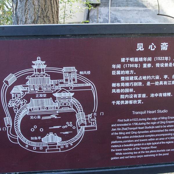 见心斋的名字出自朱熹《朱子语类》:“圣人说话,开口见心,必不说半截,藏着半截”, 成语开口见心就是这个意思,表示说话直爽,没有隐曲。见心斋南北两个小门都是很有特色的拱顶建筑,古色古香,上挂见心斋匾额。院内东侧为半圆形池塘。沿水池东、南、北三面建有半圆形回廊,泉水由龙头吐入池内。池东与轩相对者为知鱼亭,院内池轩相映,回廊临水,环境优美,雅致幽静,是个很好放松发呆的地方,比较其他地方的喧闹,这是一个适合一个人或挚友静静独处的所在!院内的几栋主要建筑,其中有正凝堂五间。