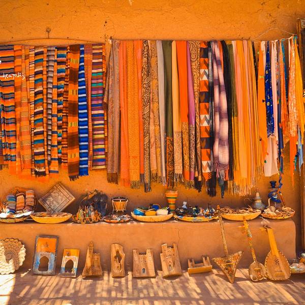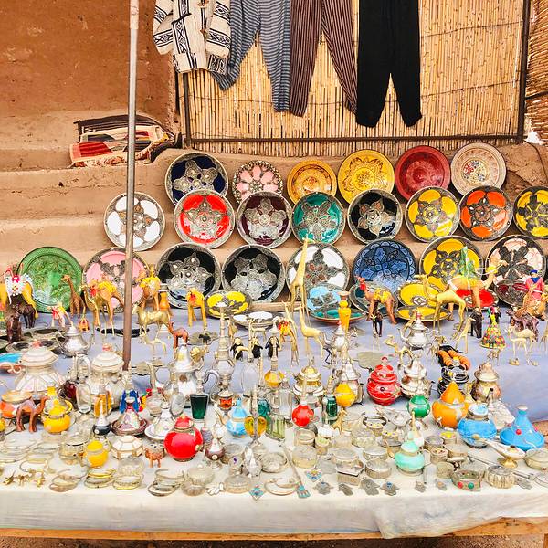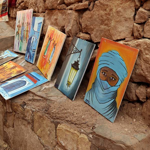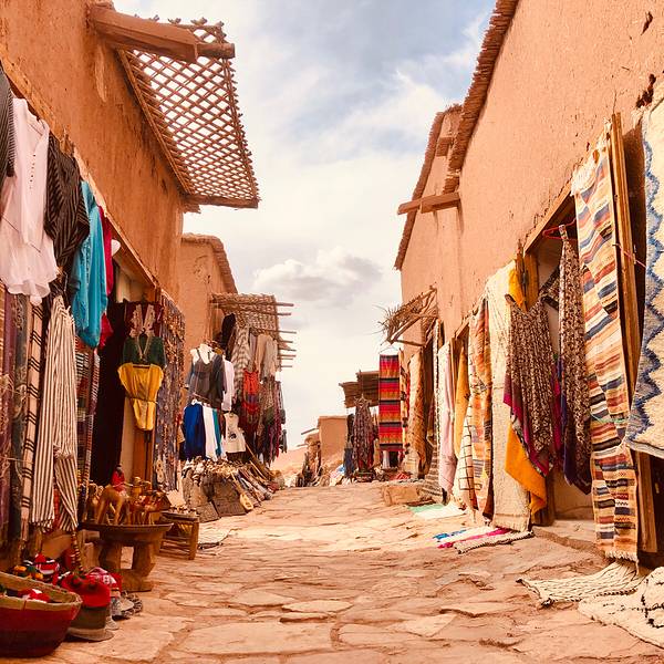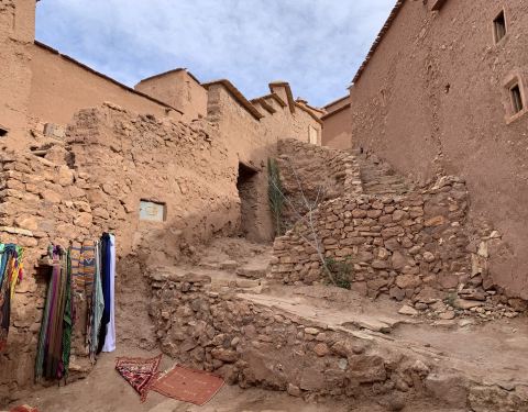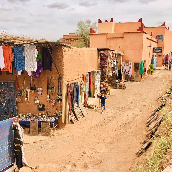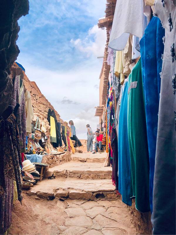 Ait Ben Haddou,这里最早期是由6座被称作"卡斯巴斯"的建筑群合成的,临近瓦迪河,历经了800多年的岁月变迁,村庄内早已是残垣断壁,不再有人居住,只是基于众多游客原因会在沿路摆设一些贩卖特色精画的小摊。