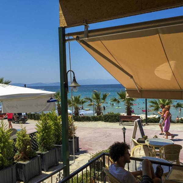 床舒服睡的就是好,早上起来就觉得精神饱满,吃过早餐准备去小店里买点东西,土耳其的地毯和围巾很漂亮,而且做工精细,我相中了一张地毯,地垫大小,说是纯手工制作的,最奇妙的是在不同的角度他会显出不同的颜色来。询问价格,老板告诉我们1500,单位是美刀!我的天啊,疯了吧,一万块买一个地毯,这是我万万不能接受的啊,只能忍痛割爱啦,唉。其实也有一些地毯的价格还是能接受的了的最后在一家超级热情的老板家花800TL买下了一张地毯,两条丝巾还有一些小纪念品。 其间老公去取钱银行卡居然被ATM吞了,银行工作人员帮忙把卡片拿了出来,但是由于中国的借记卡上没有本人的名字,所以复印了老公的护照,老公还出示了之前用这张卡取款的小票,证明这张卡是我们的,之前一直在使用,这样银行工作人员才把卡换给我们。 插曲过后满载而归,收拾了行李启程去了我们的下一站,库塞达斯。这是个爱琴海边的度假小镇,镇子很小,有一块著名的沙滩----淑女沙滩(lady's beach)。来这里的人都只有一个目的,就是玩水,所以沙滩上人很多,但这并没有影响这里海水的清澈,我们住的酒店就叫淑女沙滩酒店(lady's beach hotel),出门就是沙滩,办好入住,收拾好行李,打开阳台的大门,俯瞰沙滩,呵,人可真不少啊。