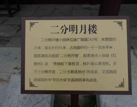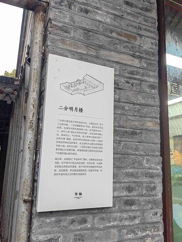里面非常安静,几乎没有游客,如果路过的话可以进去看看广陵路263号,是二分明月楼,因为唐朝诗人徐凝的那句"天下三分明月夜,二分无赖是扬州"而得名。里面非常安静,几乎没有游客,如果路过的话可以进去看看。