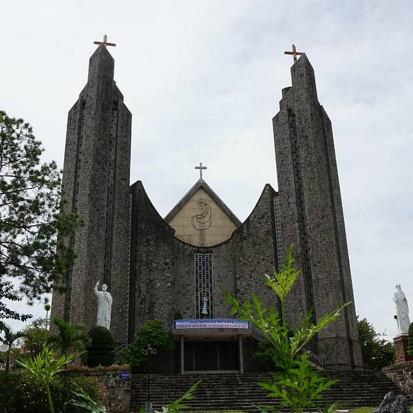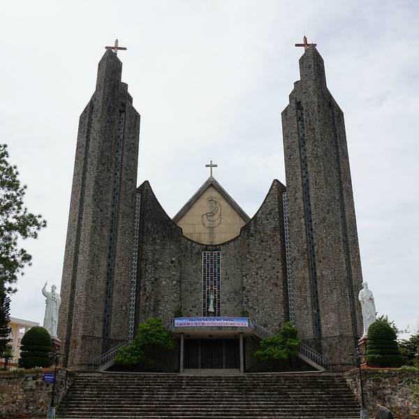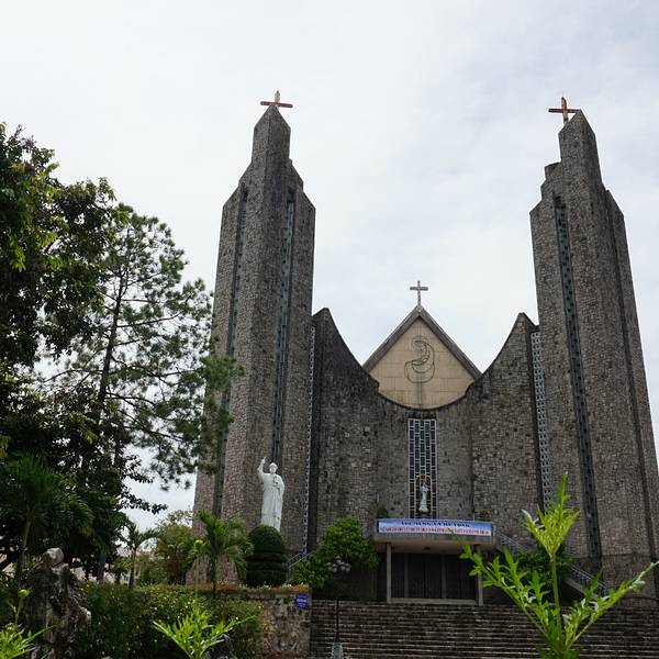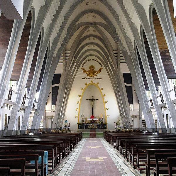 顺化最漂亮的教堂,设计比较独特。教堂坐落于小邱上面,四周环绕着树和草,构成美丽宁静的景色。