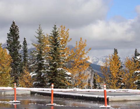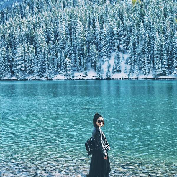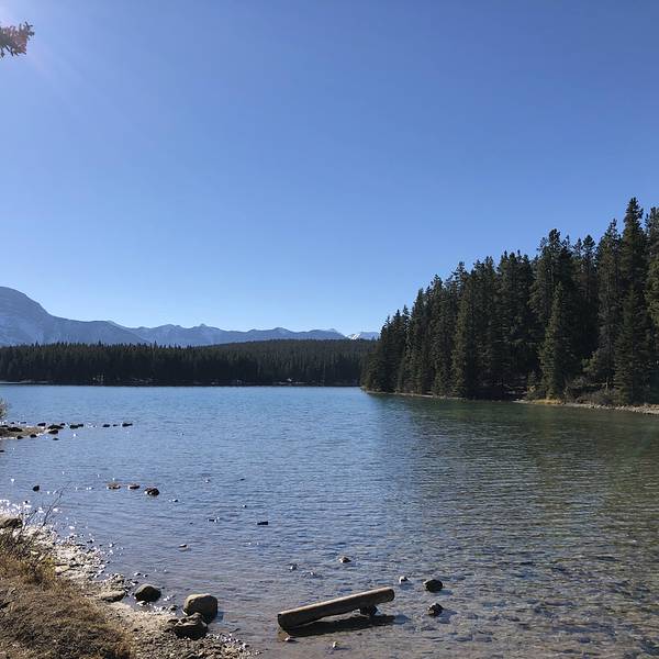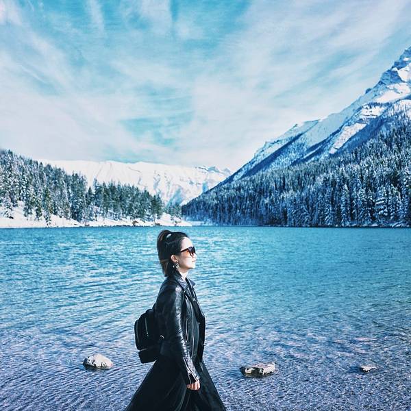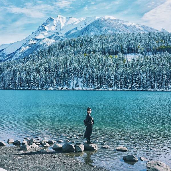 特别清澈,忍不住下去踩几脚真心冰到骨头里呀!好漂亮的一个湖,湖水的颜色是蓝绿相间的,跟湖底的起伏有关回来路过Two Jack Lake,就在去往明尼万卡的必经之路上,本是顺便一观的,没想到甚是惊艳。