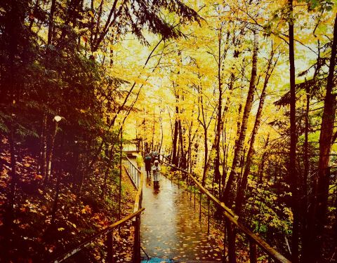 好不容易走出拥挤的蒙特利尔城区,天气阴沉,不时飘落小雨。接近中午,到达魁北克市区宾馆。下午,去著名的圣安妮溪谷赏枫。这个大峡谷是个私人所有的公园,1973年对公众开放。三座横空而架的吊桥使得圣安妮峡谷独具特色,可以从最高处的吊桥往下走,来到谷底,穿过最低处的吊桥,再从谷底的另一端回到山顶,沿途在一连串的观景台上从不同的角度欣赏瀑布全貌。这里有陡峭的溪谷和落差74米的瀑布,更重要的,每到秋季,由于峡谷内的温差将峡谷中的枫叶由低到高变成不同的颜色,漫山遍野的五颜六色的枫叶,将谷底、山腰间和山顶完全覆盖,层层美景,美不胜收,被人们誉为魁北克的“枫”景之最。只可惜今年是暖年,枫叶还未完全染红。 展开