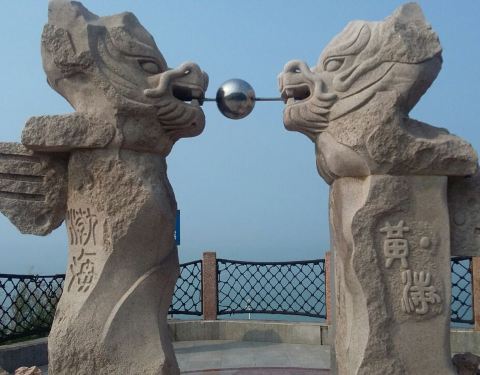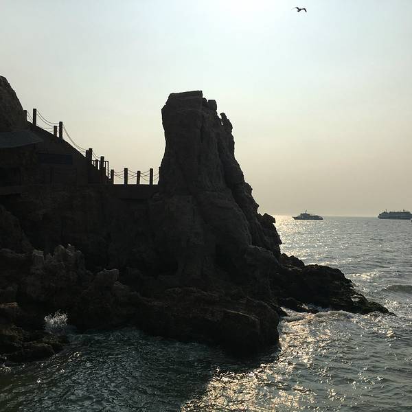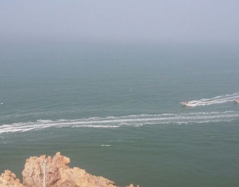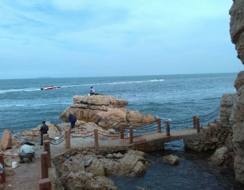 如果是从蓬莱阁那边乘坐索道过来的话,就是从合海亭这边开始走栈道。整个栈道全长才220米,但是由于形势险峻,步履艰难,全程走下来相当于爬上田横山又从上面下来,还是非常累的,而且上山下山的路程有些比较陡的路,所以不管怎么爱美,都必须要准备好一双舒服的鞋子,安全第一。在田横栈道上走过,脚下栈道的木板咯吱作响,处处险境,步步惊心,体验身边是万丈悬崖,脚下是广阔大海的奇妙感觉。尤其是有一段凌空建在悬崖上,栈道很窄,头顶是壁立千仞,脚下是海浪汹涌。栈道底下是小小的石头滩,有不少人在那里玩水捡石头。田横栈道的尽头就是黄海渤海的分界线的标志。