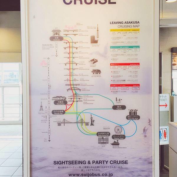 搭乘水上观光船沿隅田川航行,观赏两岸风光。亦可作为浅草前往台场附近的交通线。全程约1小时航程搭乘水上观光船沿隅田川航行,观赏两岸风光。出发地在浅草附近的吾妻桥,最远可到达台场。亦可作为浅草前往台场附近的交通线。全程约1小时航程。