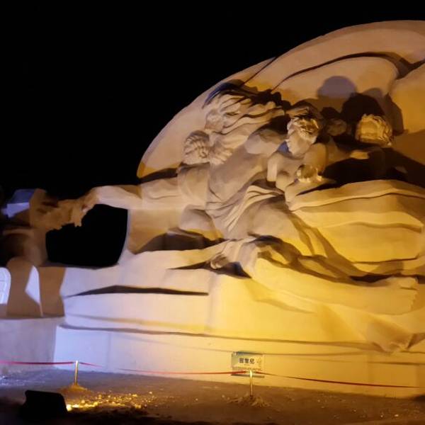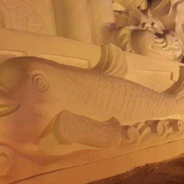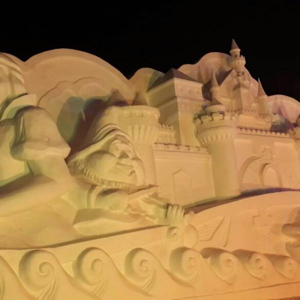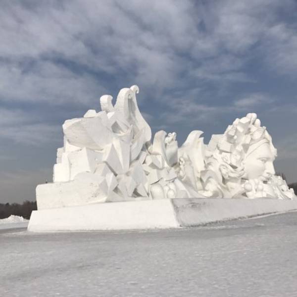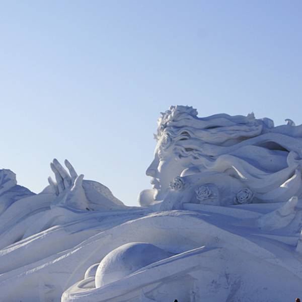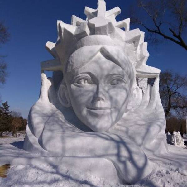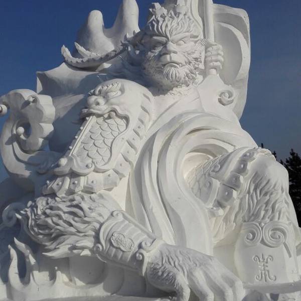 雪博会的门票那么贵其实我可以理解,因为所有的作品都是人工雕刻的,这么大一件雪雕作品,创作人员花了多少时间与经历去完成。放大仔细一看,细节也是雕刻得相当到位,特别是眼睛的部分更能体现雪雕作者的高超,要把一件雪雕作品做活首先要看人物的眼睛。惟妙惟俏的作品越能深得人心。一月初的时候还有许多雪雕作品未完成,当时还有很多在现场雕刻的作者,看着他们在冰天雪地里自由地创作,期待他们能带给大家好的作品