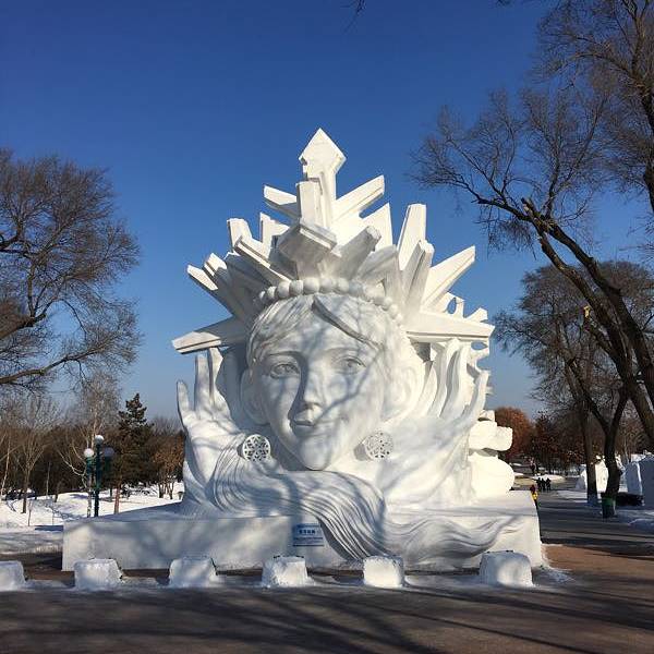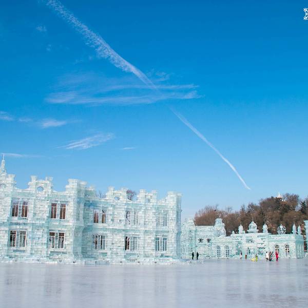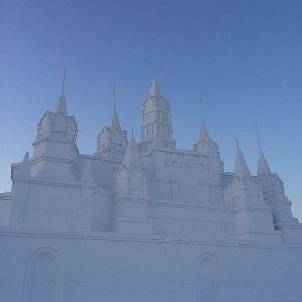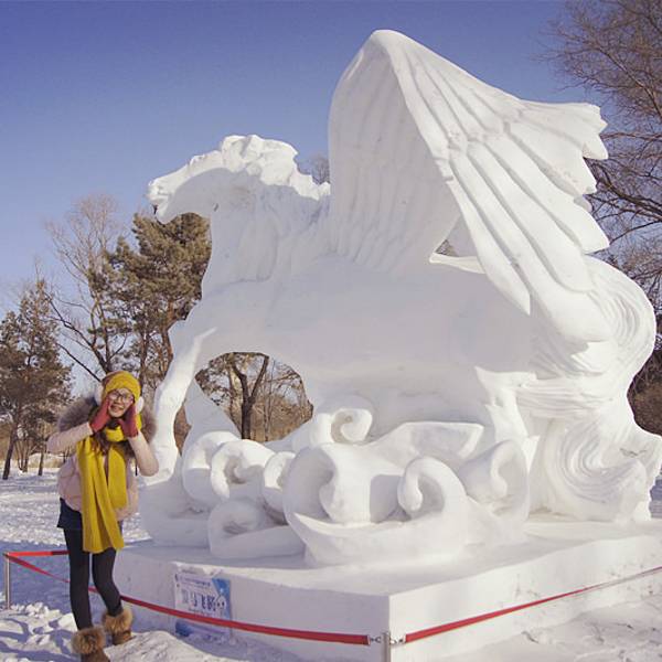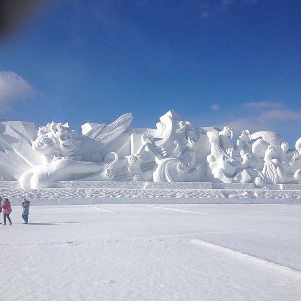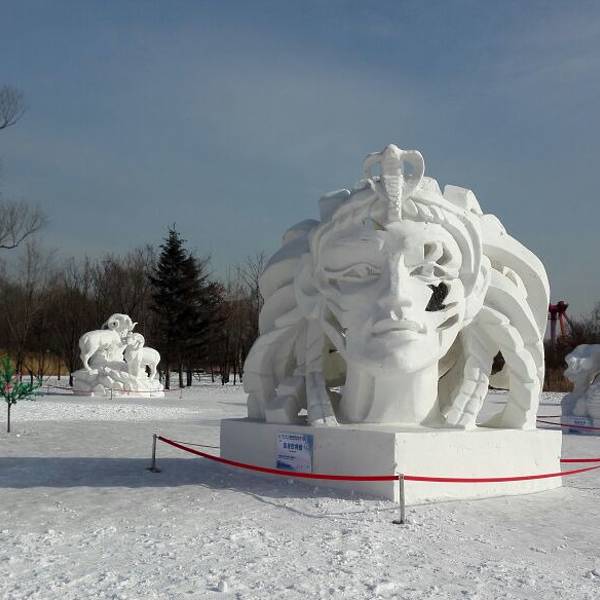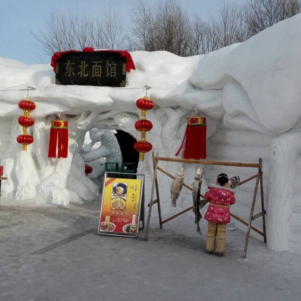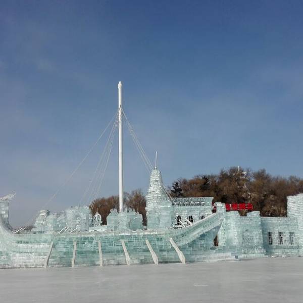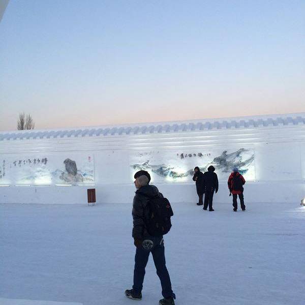 雪博会里面还有一个很大的空地,里面全都堆积着雪,索性又玩起雪来,随便那个雪球丢一丢,玩得不亦乐乎。沿着园区的道路进入,就会看到封冻的湖面上有各种冰雕,夏天的时候这里就是一个湖,冬天的时候就结成了冰,有许多人都在冰面上滑来滑去。但要小心注意的是,冰面真的很滑,很容易摔倒,一定要注意安全~夏天的湖边芦苇随处荡漾,冬天积雪埋着芦苇群,也许冬天的沙沙声略显萧瑟,但阳光永远都耀眼让你温暖。这个应该是雪博会最壮观的雪雕了,气势都已经压倒了其他雪雕作品,这么大的雪雕还是第一次见,不由地觉得很震撼。其实雪雕也是需要保养的,工作人员会往空中洒水,水会瞬间在原有的冰雕上结冰,达到了一定的保持形状的作用。雪屋子,其中有几间是可以进去的,不要以为雪屋子里面很冷,其实里面都有冷气,是提供给游玩过程中特别冷需要保暖的游客进去休息的,有个休息的屋子可以寄明信片可以喝热奶茶,大概价格是十元一杯。
