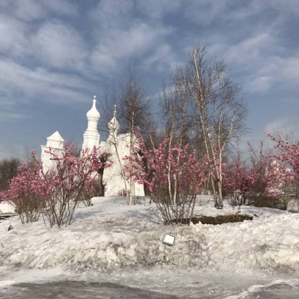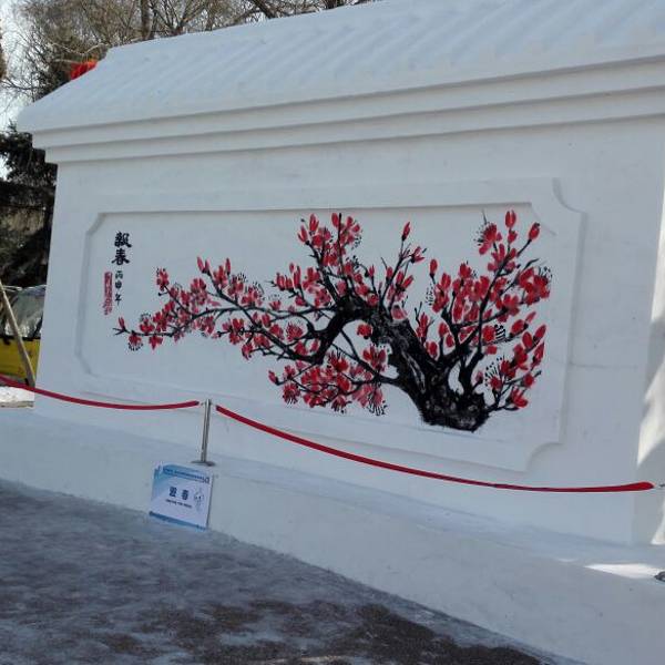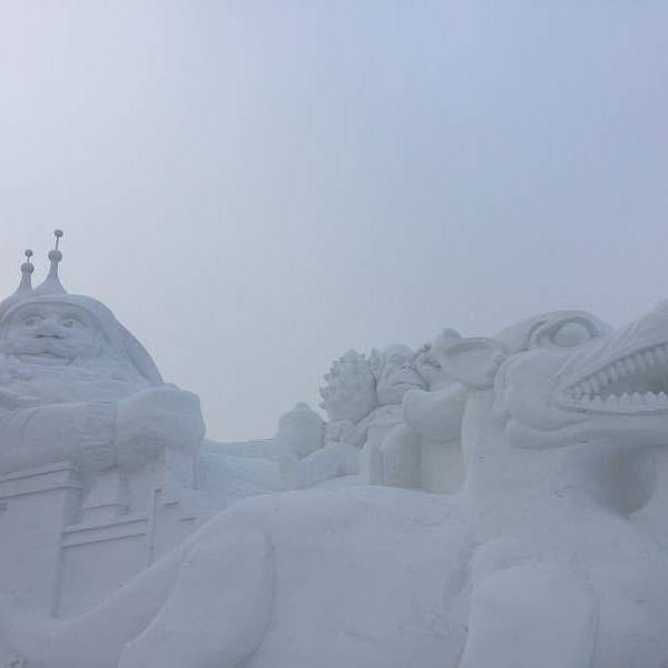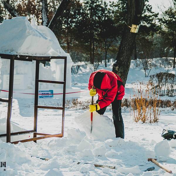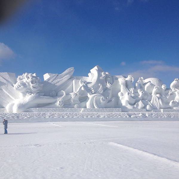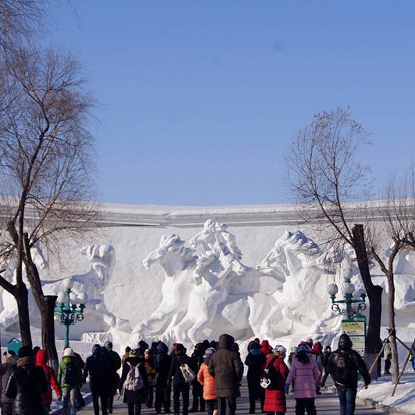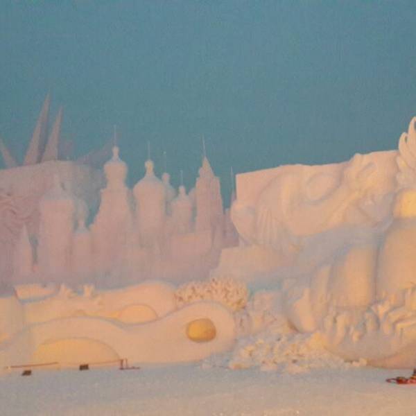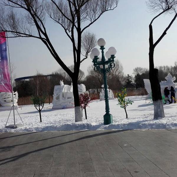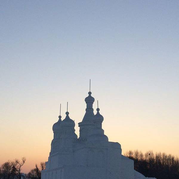 雪博会里面还有一个很大的空地,里面全都堆积着雪,索性又玩起雪来,随便那个雪球丢一丢,玩得不亦乐乎。沿着园区的道路进入,就会看到封冻的湖面上有各种冰雕,夏天的时候这里就是一个湖,冬天的时候就结成了冰,有许多人都在冰面上滑来滑去。但要小心注意的是,冰面真的很滑,很容易摔倒,一定要注意安全~夏天的湖边芦苇随处荡漾,冬天积雪埋着芦苇群,也许冬天的沙沙声略显萧瑟,但阳光永远都耀眼让你温暖。这个应该是雪博会最壮观的雪雕了,气势都已经压倒了其他雪雕作品,这么大的雪雕还是第一次见,不由地觉得很震撼。其实雪雕也是需要保养的,工作人员会往空中洒水,水会瞬间在原有的冰雕上结冰,达到了一定的保持形状的作用。雪屋子,其中有几间是可以进去的,不要以为雪屋子里面很冷,其实里面都有冷气,是提供给游玩过程中特别冷需要保暖的游客进去休息的,有个休息的屋子可以寄明信片可以喝热奶茶,大概价格是十元一杯。