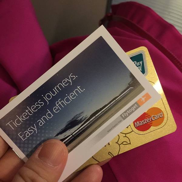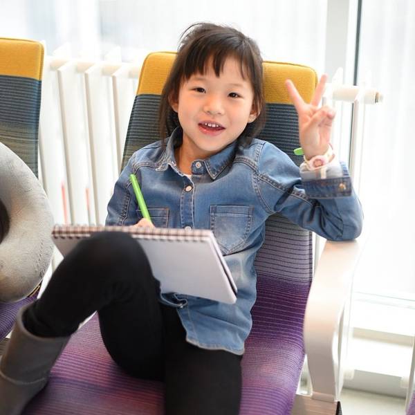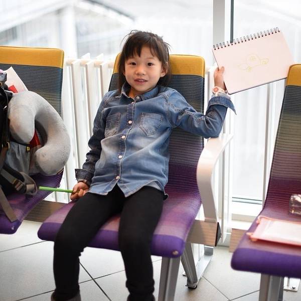 从酒店去机场还是搭乘机场快线,买票的机器很先进,刷一下信用卡就行,不用出票,车票信息直接记录在信用卡上,高效环保。上了车漂亮的列车员看到小妞马上送来了小礼物,可以挂脖子上的袋子里是彩笔和贴纸涂色书,做工精美,用的材料野狠环保,简直不能更贴心。