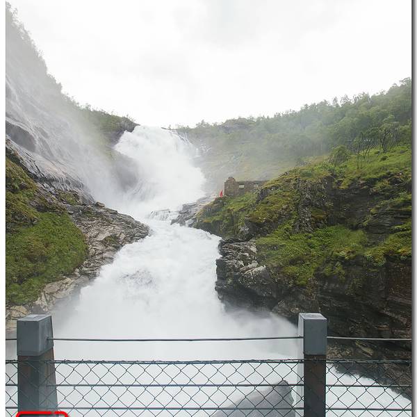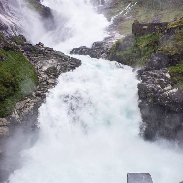 尤斯瀑布(kjosfossen),海拔669米,距离米达尔4.4公里,距离弗拉姆45.6公里,火车在巴克里隧道出口处停了下来,就是壮观的尤斯大瀑布。瑞农戈湖的湖水,经过一处引水道,再流经发电厂后,在这里形成一个大瀑布。细雨濛濛中,我们走下走,欣赏这高度落差达到93米的瀑布,水量丰沛倾泄而下,水的冲击声隆隆不絶于耳,令人震憾。
