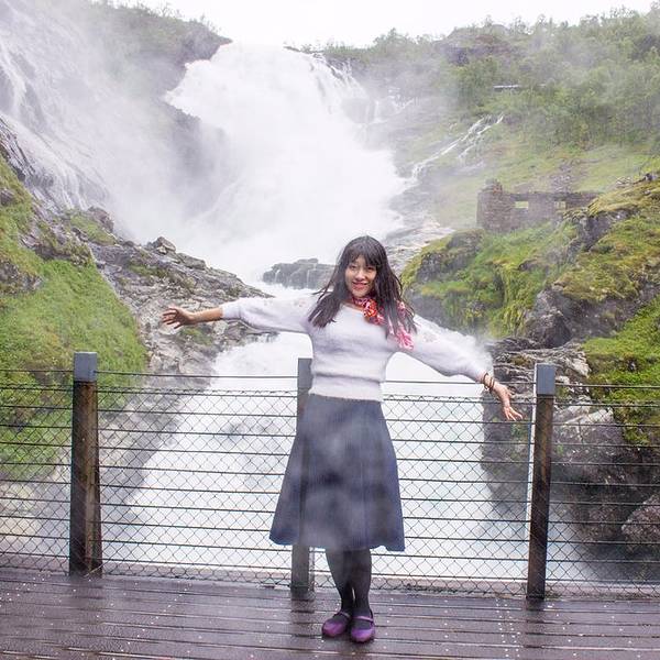 ...外,还可以看到一位穿着红裙伴着音乐在瀑布前偏偏起舞的仙女,据说是北欧神话传说中居住在山中的仙女中途会在Kjosfossen大瀑布处停留5-10min,除了壮阔的瀑布外,还可以看到一位穿着红裙伴着音乐在瀑布前偏偏起舞的仙女,据说是北欧神话传说中居住在山中的仙女。