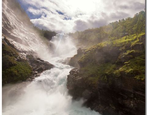 尤斯瀑布(kjosfossen),海拔669米,距离米达尔4.4公里,距...往返于弗洛姆与米达尔之间的观光火车,在行驶到“kjosfossen”车站时会停车两次(来回各停一次),让游客欣赏美丽、壮观的“尤斯瀑布(kjosfossen)”