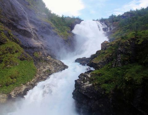 Kjosfossen瀑布,是挪威著名的景观火车Flamsbana从Flam开往米达尔的一站,火...Kjosfossen瀑布,是挪威著名的景观火车Flamsbana从Flam开往米达尔的一站,火车停靠瀑布几分钟,游客们可以下车站在瀑布留念拍照,瀑布蛮大的,声音蛮响的,下午还能有幸看到彩虹!