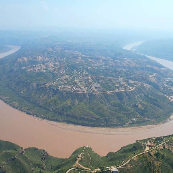 从路遥纪念馆出来,继续向清涧县城走。沿途车辆较多有点堵塞,距离县城约6、7公里时,前方路牌指示有去往山西石楼县方向的道路,并且,有旅游指示牌指示可以去延川县境内的黄河太极湾。这一定是条新修的公路,因为地图导航上都没有,且一眼看去这条路上车辆稀少,我们当机立断,走这条路去黄河太极湾。 实践证明,这是一条车辆很少的道路。在快到黄河边大概20多公里处我们按路牌指引去太极湾,这实际上应该也是陕西沿黄公路的一段。在弯弯曲曲,车辆稀少的山路上行驶,晚上6:30分,在天色暗淡的最后一刻,我们来到了太极湾,弥补了我们在永和关遥望未及的遗憾。