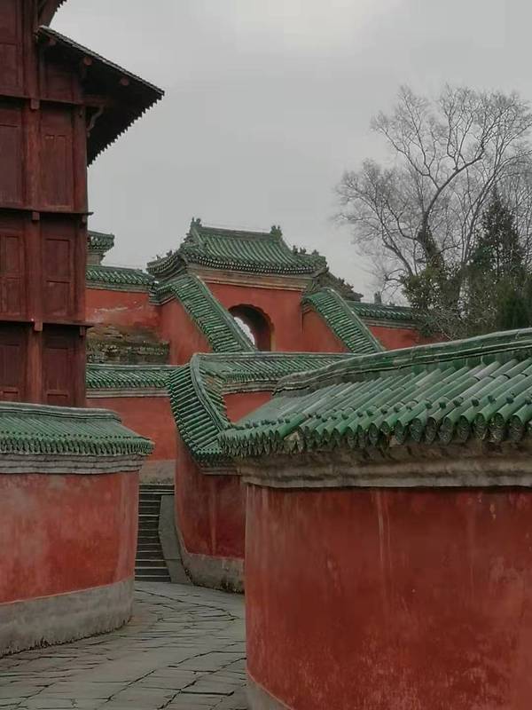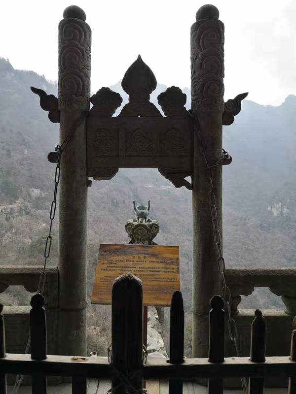 在这个危岩峭壁上,镶嵌着一排殿堂亭阁,就是南岩石殿。悬崖峭壁处有一条古栈道,这是通往两仪殿、天乙真庆宫和龙头香景点栈道。