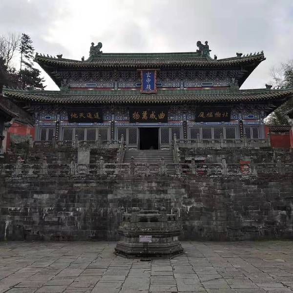 玄帝殿大殿正面的五开间,中间三间大,两边两间小。正中的三开间都悬挂着横匾。正中的横匾写着:“曲成万物”、左边的横匾写着“道通天地”、右边的横匾...武当山规模最大、最为奇观、险峻的古建筑群当属南岩宫。