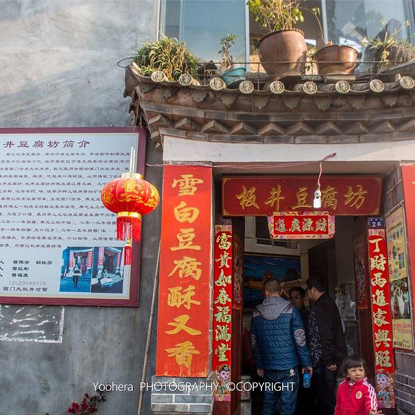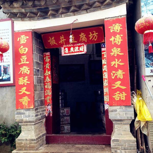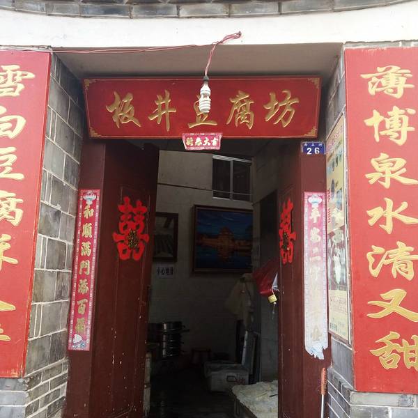 小巷的尽头有一块井,古城周边有不少的井,这一块最大,当地人叫他“大板井”。当地人喜欢用井水做豆腐,所以大板井旁有一家做豆腐的老店——板井豆腐坊。板井豆腐坊是一个豆腐作坊,你可以入内参观如何制作豆腐,还可亲自体验(塞5块钱)。豆腐坊出售生豆腐,0.2元一块,但不卖烤好的豆腐。板井豆腐坊每天早晨供应全豆自助早餐:豆腐脑、豆浆、炸豆皮随便吃,5元一位,相当实惠。