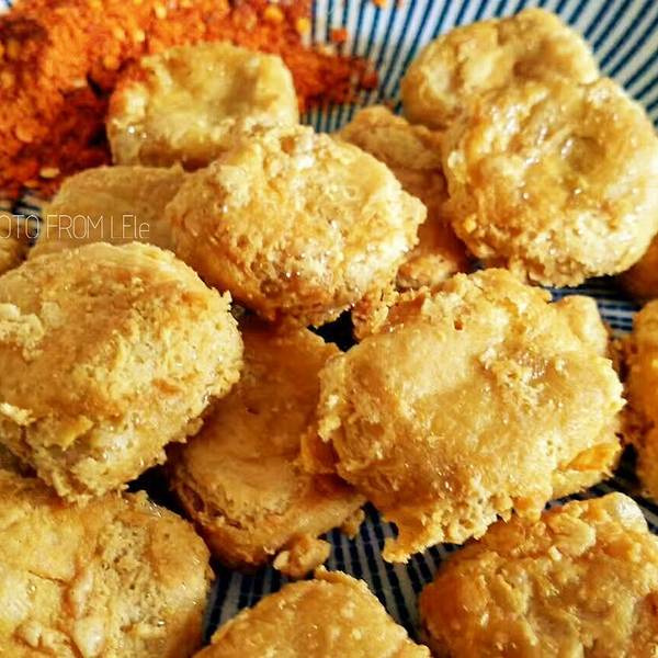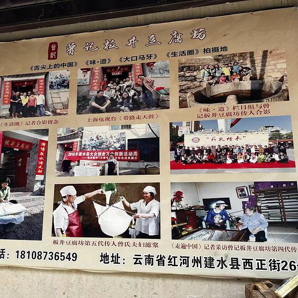 第二天一早起床就带上我的空瓶子打车来到古城西门,去大板井打水,去板井豆腐坊吃豆腐早餐。西门从这里进去看到的第一根电杆处左转,一直走到头就到了。曾家的【板井豆腐坊】,从清朝光绪年间开始做豆腐,已经130多年,据说建水的豆腐大部分都是出自于他家,而他家的豆腐,制作的时候用的都是旁边古井里的水,所以味道鲜美,品质好,建水豆腐都不需要用石膏点的,大板井的水能做出最好的豆腐。曾家豆腐在建水名气较大,问及老人,豆腐做得好吃,有何诀窍,老人脱口而出:“用心做,自然好吃”。 就这么一句“用心做”,曾家豆腐一口气做了100多年,传了几代人,成了建水豆腐作坊的品牌。至今, “板井豆腐坊”的豆腐,仅过滤工序,就有十多道。曾红彬说,做人,和做豆腐一样,杂质滤得干净了,人品就好了。在建水,不完全统计,类似的豆腐坊有500多家。中原文化的魂,在豆腐坊的建水人家,扎了根,更有体现。 胡桂芬老人的儿子曾红彬,17岁就开始做豆腐,现在是豆腐坊第五代传人掌门。随着产量增加,现在做豆腐不用小酒杯了,用手包,极快,一个人一天可以做3000多个。“板井豆腐坊”一天的大豆原料要用400多公斤,有十多个小工,产品卖到全省各地。对了,他家还上过【舌尖上的中国】,之后大多游客都慕名而来。纯手工豆腐豆腐坊内,交5块钱可以随便品尝各种豆制品,豆浆,豆花,豆腐脑,炸豆皮,甜的咸的随意,就不存在甜咸党之争了,哈哈哈,5元管饱,只要你吃得下想吃多少都可以,就是不能浪费。 对了,一定要赶早,他家豆腐吃完了就没有了,上次来就没有了,让我后悔没有早起,这次九点左右到的,还有。最喜欢吃这个炸豆皮了,我还是第一次吃炸的,美味。5元管饱,随便吃他家也有手工豆腐和豆腐皮在卖,盒子装的,买回家很方便,需要的可以带些回家,价格非常实惠。我是懒得提就没有买,反正经常来,再不济也有强大的某宝,可以买回家自己发酵,哈哈哈。 (放上两张我在家里做的烧豆腐和油煎豆腐)干烧豆腐豆腐和单山青花椒蘸水简直是绝配!油煎豆腐
