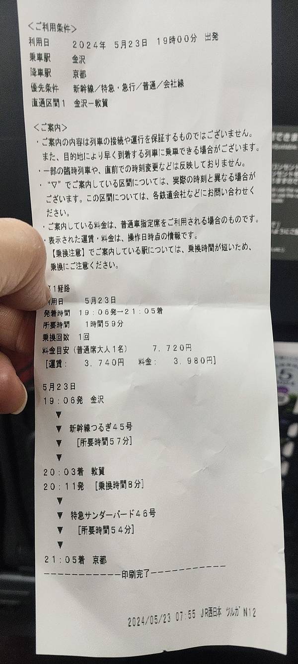 售票站员耐心的给我们打印来去票务方案,补齐到敦贺的特级费+到金沢的新干线票,和回程京都的全程车票为东茶屋街走了不少路程也有些累了,,走到美术馆门口内,见对游客有限制性的注册入内,似乎入馆不顺畅就远远的对这着那泳池照了张像就作罢了。售票站员耐心的给我们打印来去票务方案,补齐到敦贺的特级费+到金沢...为东茶屋街走了不少路程也有些累了,,走到美术馆门口内,见对游客有限制性的注册入内,似乎入馆不顺畅就远远的对这着那泳池照了张像就作罢了。售票站员耐心的给我们打印来去票务方案,补齐到敦贺的特级费+到金沢的新干线票,和回程京都的全程车票。中间没有意思怠慢和不耐烦的态度,佩服,很棒!进入普通车站前询问站员,毕竟乘上普通车次后如何顺畅到达有些不明,站员告诉我们,尽管普通车能到达,但是中间有两次我们是要下车换乘的,让我拍下上面这张截图做参考!果然是这样!真心感叹他们的敬职和负责!一次是下车等候下一列车,第二次下车时是要换站台的,这还是在询问了一位下班后的列车司机才知道的,还差点延误,侥幸列车晚点才让我们乘上。 展开