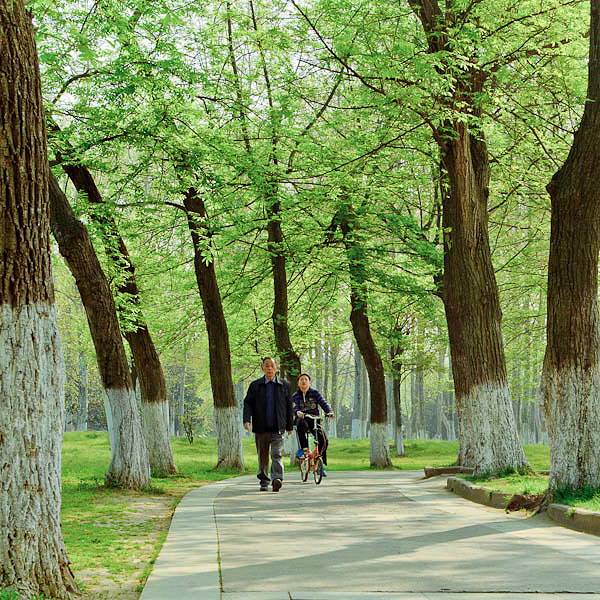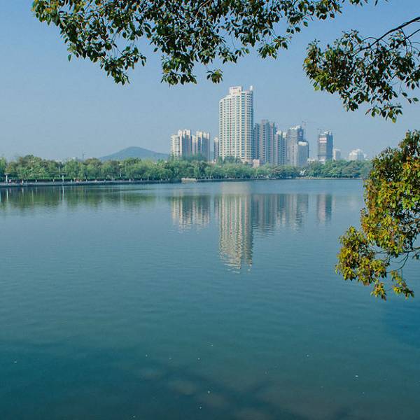 雨山湖公园位于马鞍山市。雨山湖娟秀妩媚,周围有9座山峰远近错落,环湖而立,素有"九峰环一湖"之美称。其因湖而开辟的公园,则景色秀美、风光旖旎。环湖皆路,环湖皆树,环湖皆楼,其中湖北路程和红旗桥的临湖一带,是游人观赏湖光山色的园外之园;湖西路有依湖而建的具有明清建筑风格的富园贸易市场和近2万平方米的绿色游园;湖南路则是柳岸花堤,有近万平方米的小游区,天水一色,是人们休闲憩息的佳处。
