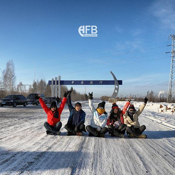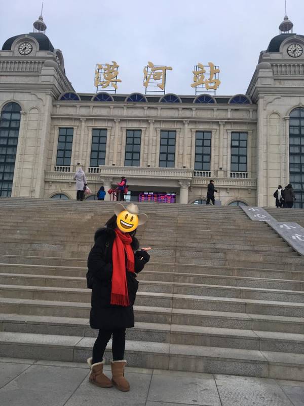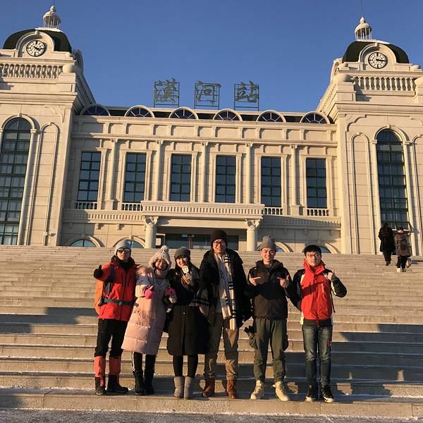 07:25火车抵达漠河站,与队友约好的集合时间是07:30。预定的包车已经在火车站等候。上车直接出发去景点。一派冰天雪地漠河出站的温度是-40,拍张照片手就僵了,赶紧戴上手套。太阳出来后温度上升比较快,很快就不冷了,车站远处的烟囱冒着浓浓的水蒸气部分队友合影
