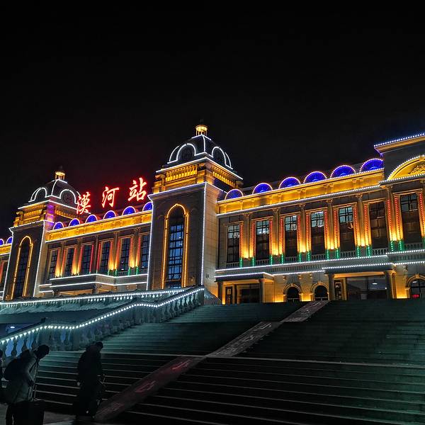漠河火车站建得还是挺有特色的,然后本来以为出火车站都是商业街,到了才发现并不是。出口有很大的广场,大面积都是用来停车的,出站很好坐车,的士起步价十元,到北极村的班车25,固定的,不要被坑。车站周边比...