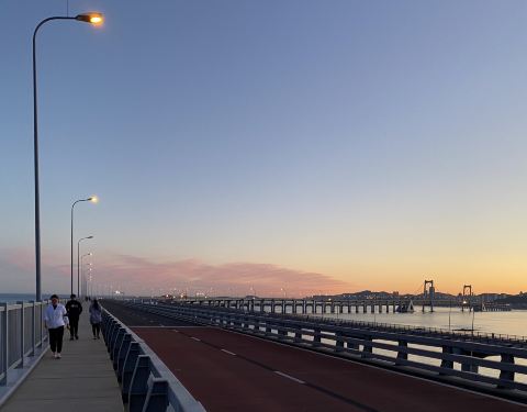 星海湾大桥全长约6公里,两侧设计有步行道可以跑步也可以观景,经常能看到在大桥上跑步的人。东岸有一条折返桥联通两侧。跑上一个来回12公里,也挺惬意的一件事。不过对于我这个扛着相机三脚架的人来说就不是那么轻松的事了。从西岸走到了桥中心正对星海广场的位置决定返程。因为实在没有什么可拍,空气中海油一点污染的味道让呼吸道有一点难受。而天气预报空气质量确实优也是醉醉的。大桥上不允许停车,本以为走到桥下就能打到车,结果发现自己还是too young too simple。滴滴出租和快车根本就打不到。无奈一气之下扛着相机暴走回了酒店。一大清早走了11公里。 展开