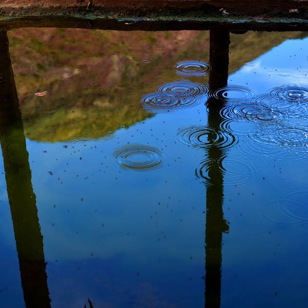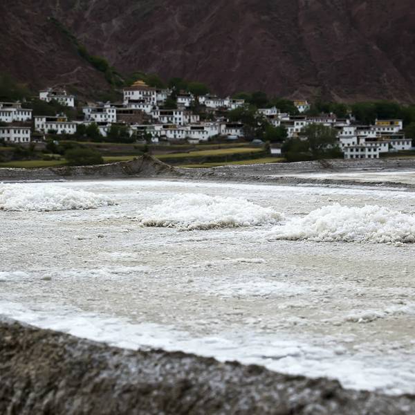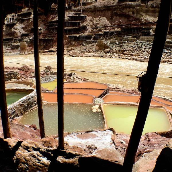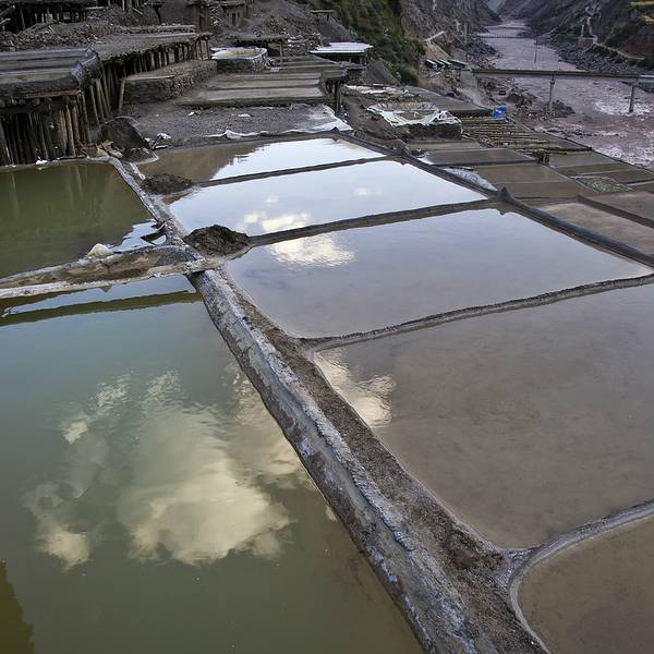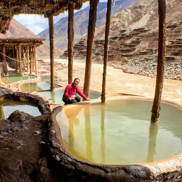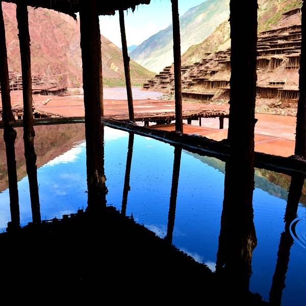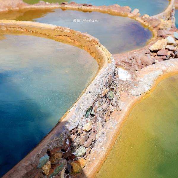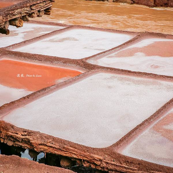 每次灌满卤水,两三天就能在每块盐田上收获结晶盐10来公斤。盐水中倒映出天空的颜色,真美。我们弯着腰穿梭在盐田之间,欣赏这“阳光+风+时间“的作品。从盐田出来,见证了318一言不合就封道的路况。