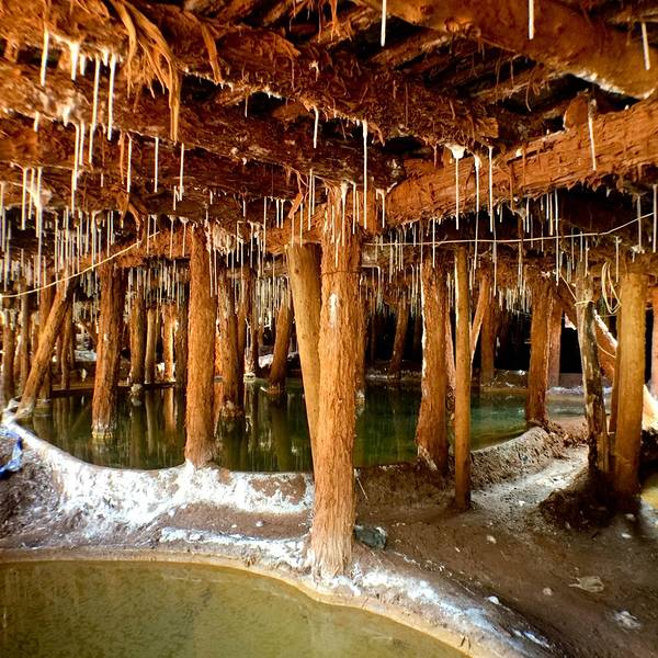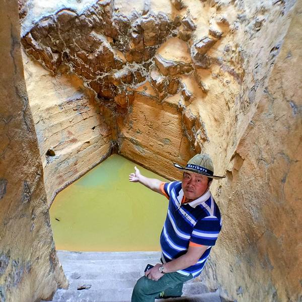 这儿的盐水井有的深近10米,工人们身背圆柱形的木桶,