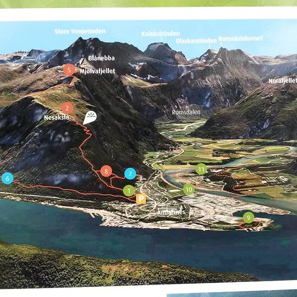常规路线从海拔约400米的Vengedalen山谷的停车点Venjesdalssetra出发,上升约800米至最高点约1200米处,之后一路下降返回到翁达尔斯内斯(Åndalsnes)城里。全程约10公里,需7小时左右,难度比较大,个别地方较为陡峭,适合成人。