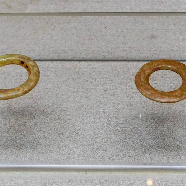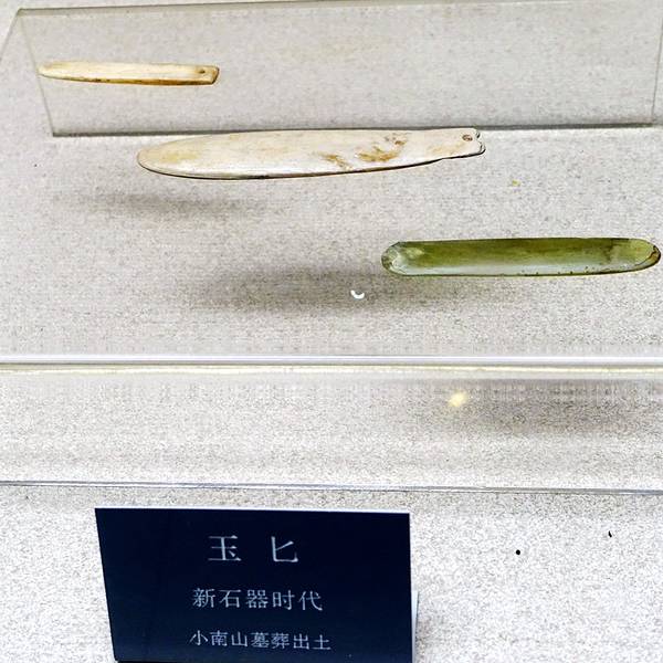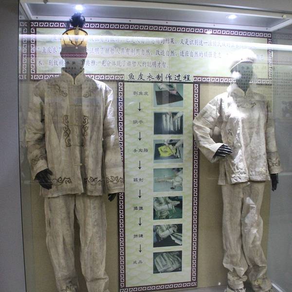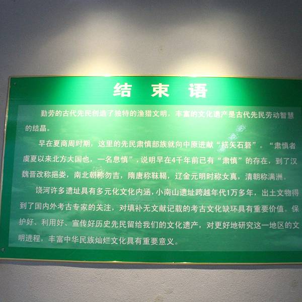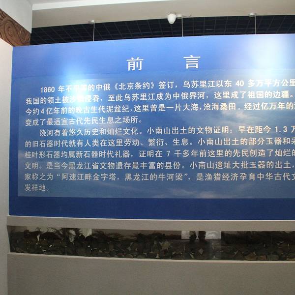 小南山下的饶河博物馆主要陈列饶河古代文物、抗联七军史、赫哲族等少数民族民俗文化。 个人觉得这个博物馆还是挺值得来看的。不过这个博物馆有午休的门厅浮雕。乌苏里旋纹所围成的圆环代表古代先民对太阳神的崇拜公元前三千年左右,饶河属于“肃慎”民族居住区。 不同时期对肃慎的叫法不同,汉魏晋叫挹娄,南北朝叫勿吉,隋唐五代时期叫靺鞨。宋辽及元明清时期,这里居住的民族叫女真族。努尔哈赤统一了北方女真族部落,皇太极改女真族所居之地叫满州,女真族改叫满族。 饶河地形图在1991年7月29日,边防部队在饶河县小南山的主峰之巅修建瞭望塔,深挖地基时发现了一座7000-7500年新石器时代双人合葬墓,随葬品有大批玉器和石器,其中玉器62件、石器56件、牙饰3件,部分文物被国家鉴定为一级、二级文物。 小南山是目前我国发现的最东部的旧石器时代人类活动遗址,证明了早在一万五千年前这里就有远古人类繁衍生息,因此被郭沫若等著名历史学家、考古学家赞誉为“黑龙江的牛河梁”、“阿述江畔的金字塔”。展出的部分小南山出土文物 (国家一级保护文物)桂叶形石器 (新石器)。这是目前中国发现的最大一枚桂叶形石器,是作为一种礼器所使用的,是用石头打磨压制而成的,非常精美,且罕见。(国家二级保护文物)乌苏里旋纹陶罐(新石器) 陶罐的腹部刻有形似乌苏里江水纹的图案,被称为乌苏里旋纹陶罐。玉斧(新石器)石斧(新石器)玉玦(新石器)玉环(新石器)玉珠(新石器)玉匕(新石器)古代历史展厅的其它文物 (国家二级保护文物)鎏金龙凤银碗 (辽金)。出土于八五九农场,是一个农民在耕地是时候犁出来的,所以破损严重。 整个碗的碗体都是银的,底部镀了一层鎏金,在碗的底部刻有龙和凤的图案,相互盘绕在一起,是皇家所使用的。(国家三级保护文物)铜镜(辽金)。在镜子的背面刻有舞女嬉戏图六耳锅(辽金)。六耳锅在辽代已较流行,而金代沿袭并有所发展。多为铁质,铜质的相对少见。当时人们在游猎或行军打仗中,需要临时安营扎寨,埋锅造饭,众多的人吃饭需用大锅。而女真人喜欢的食物中,羊、牛、马占有很大比重。他们又习惯煮食大块肉,这种六耳锅恰巧适应了当时的需要。为金代典型炊具。马配饰(辽金)。猛犸象牙门齿化石与披毛犀骨化石