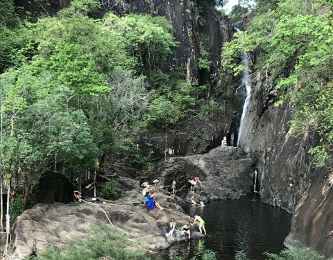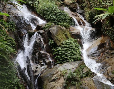 这是一处隐藏在深山雨林之中的瀑布,瀑布的水量不是很大,形成了一个一个清澈的水潭。瀑布细细的涓流,非常的清秀,具有着浓浓的仙意,水潭中有许多的小鱼,真的是非常的漂亮,这里也可以下去游泳,可以好好的体...