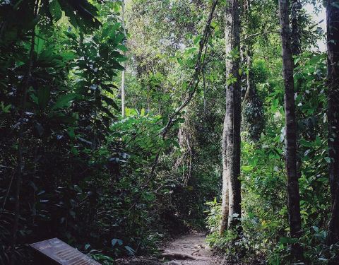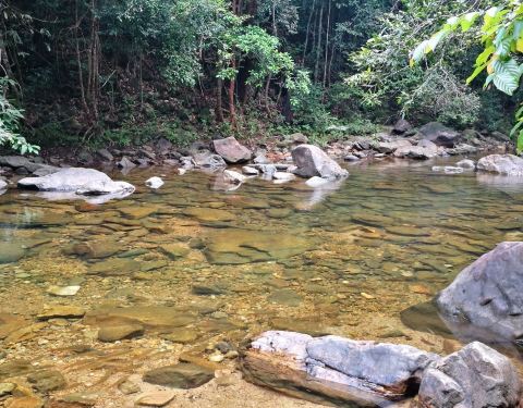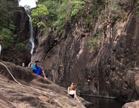这是象岛上森林里的一处小型瀑布,瀑布靠外的地方,水域面积小,深约1.5米左右,到处是大鱼和小鱼。和这些鱼儿在大自然瀑布下一起玩耍,这感觉太难得,鱼会来咬人的脚丫吃死皮,刚下水大家都叽哇乱叫,之后就潜水游泳了,实在是非常的有趣。
