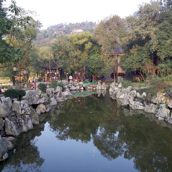 宜宾江北公园位于宜宾市江北,宜宾市郊之北,有崔科山(也名天柱山)横亘之际。山下,一巨石中开,形成天然峡谷,谷深20余米,谷底有清泉缓缓流出,绕谷底没入石中,为一天然奇观。