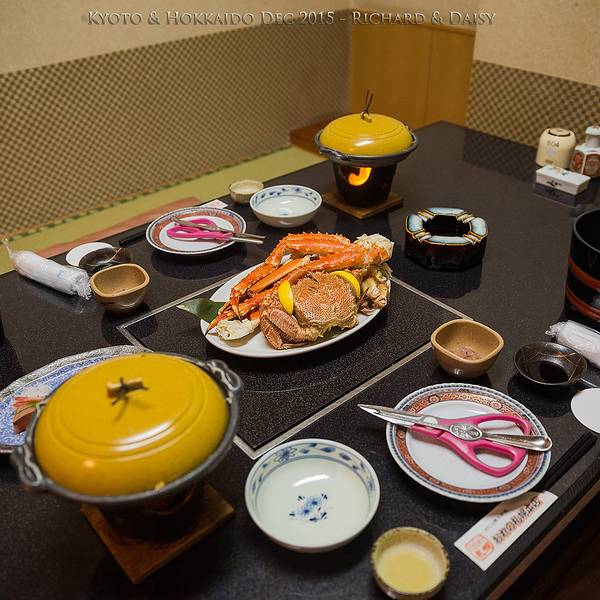 【螃蟹大餐】 离开小樽返回札幌,我们事先在E路东瀛预定了札幌的“我的”螃蟹总店,人均220人民币左右,不是自助是套餐。可以报销去程的出租车费1000日元内,地址:北海道札幌市中央区南7条西6 ORENO札幌大厦。螃蟹是北海道的必备选项,E路上有很多螃蟹套餐,这个套餐包含了 “帝王蟹”“毛蟹”“松叶蟹“日本最知名的三大蟹,本来也是来尝尝鲜,就都试试好了~~这家是在包厢里面吃套餐,所以还是很有日式的感觉~