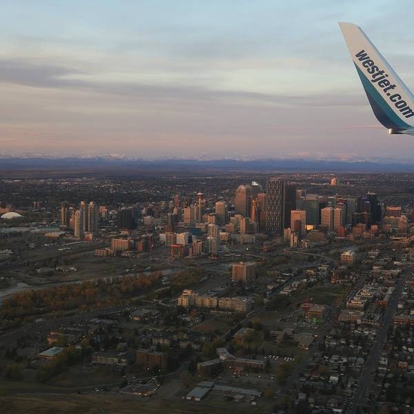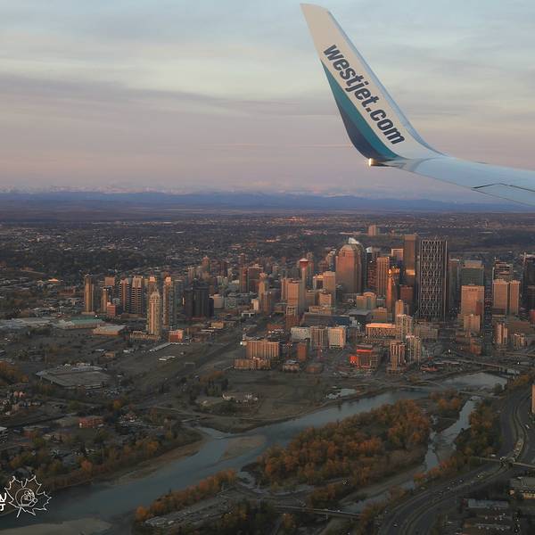 从黄刀清晨6点的飞机到卡尔加里,第一次在飞机上看日出很兴奋,太阳从地平线升起,染红了云彩,渐渐变为耀眼的金黄。选择一次清晨的飞机,确实不错的体验。从飞机上航拍卡尔加里,清晰可见卡尔加里的地标建筑——卡尔加里塔,远处是连绵的落基山脉。2. 卡尔加里机场
